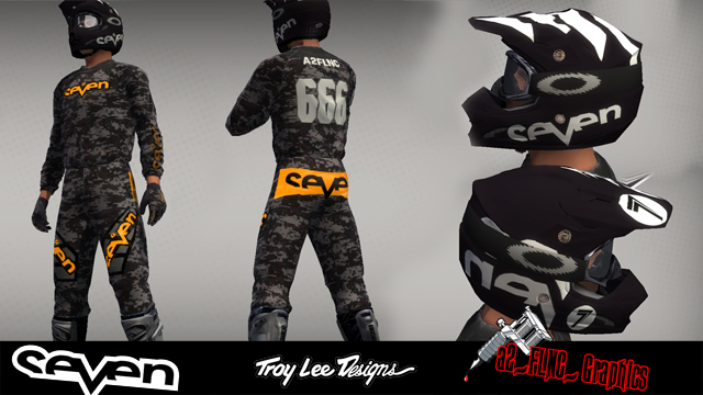 This is the reproduction of the Seven MX camo gear and Troy Lee Design Se3 black Seven helmet.