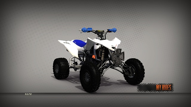 Please excuse my crappy renders, the quad is all white with blue seat, two maxxis stickers on front fenders, a yamaha tuning fork logo on front, yamaha on seat sides, boxes around numbers and a gaerne sticker on rear plate. Add me on steam (aray7654) for feedback/requests. Thanks and enjoy