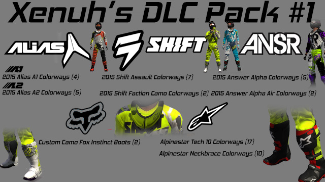 Hey everyone, this is a pack that I've been working on for a while now. It contains several sets of Alias, Answer, and Shift gear. Also included are various colorways of Alpinestar Tech 10 boots, Alpinestar neckbraces, and 2 custom Fox Instinct boots (all credit to Karpuha for the Instinct normal map and skin, all I did was edit the colors.)