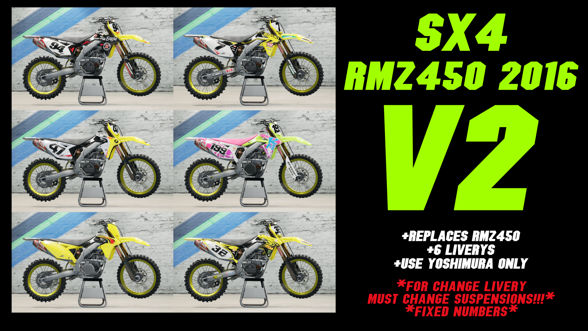 RMZ450 2016 V2 for MESX 4To install just unpack the file into "Steam/steamapps/common/Monster Energy Supercross - The Official Videogame 4/supercross4/Content/Paks"Have fun!"